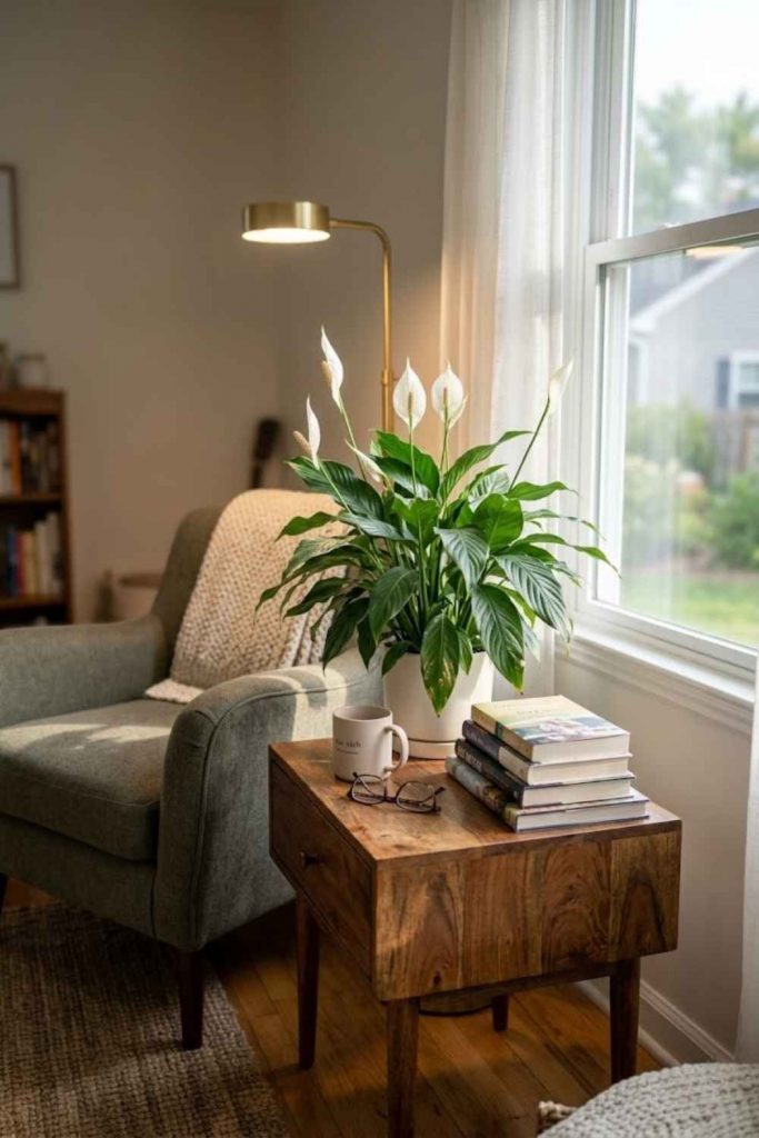 It offers a sharp white contrast to its deep green foliage, softening the look of a library corner. The plant will visibly droop when thirsty, taking the guesswork out of watering.