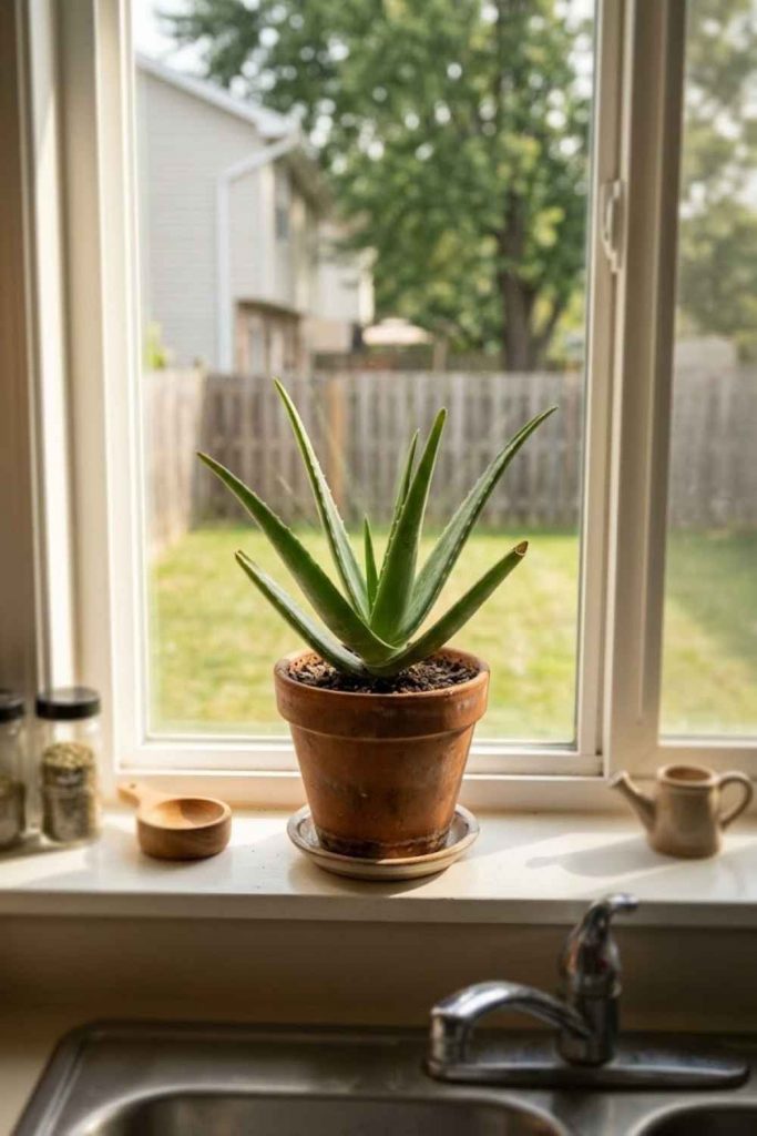 A sunny kitchen windowsill is the ideal spot for Aloe Vera. It releases oxygen at night and provides a cooling gel that can help soothe minor kitchen burns during cooking.