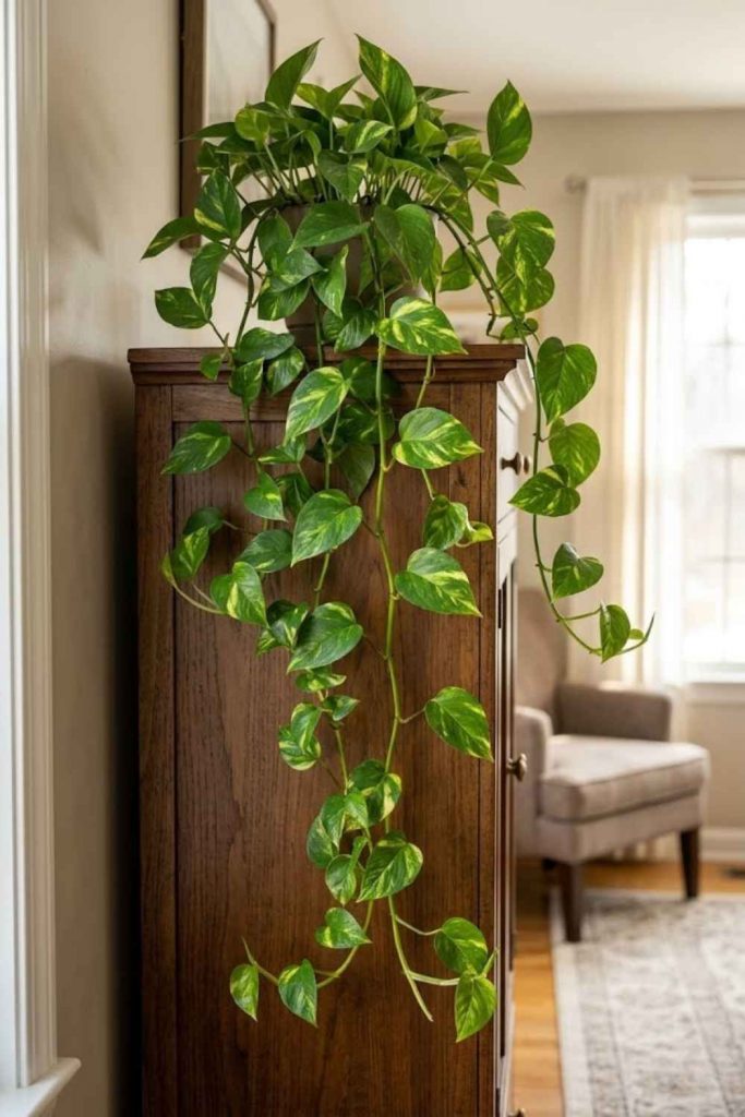 Its variegated leaves grow quickly, filling empty shelves with minimal effort. The glossy leaf surface allows you to wipe away dust in seconds with a damp cloth.