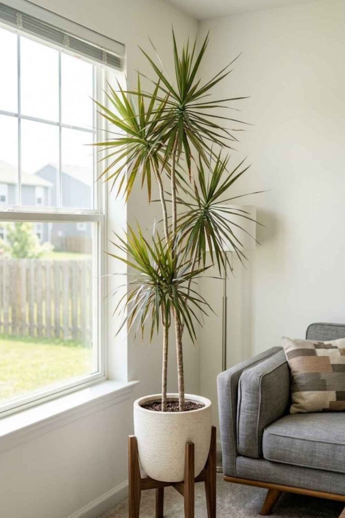 The Dragon Tree is a simple way to add height to a living room without worrying about soil mold, thanks to its inherent drought tolerance.