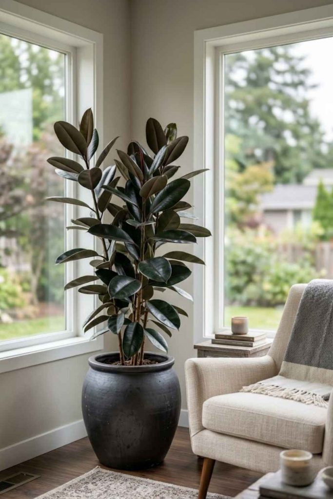 Its massive, waxy leaves bring a sophisticated presence to a sofa corner. Place it in bright, indirect light to keep the leaves shiny.