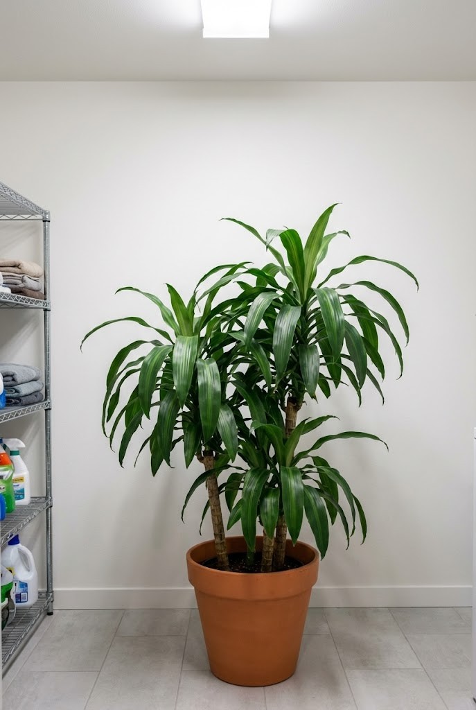 If you have a windowless room where the overhead light is on for work, laundry, or daily routines, this is a clean “height + greenery” choice that doesn’t demand sunlight.