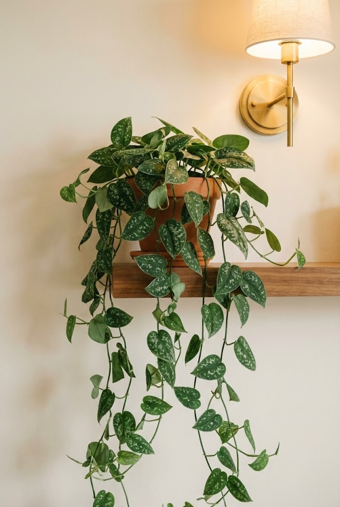Golden pothos is one of the most forgiving trailing plants for artificial light. It’s especially good when you want softness on a shelf or console without taking up surface space.