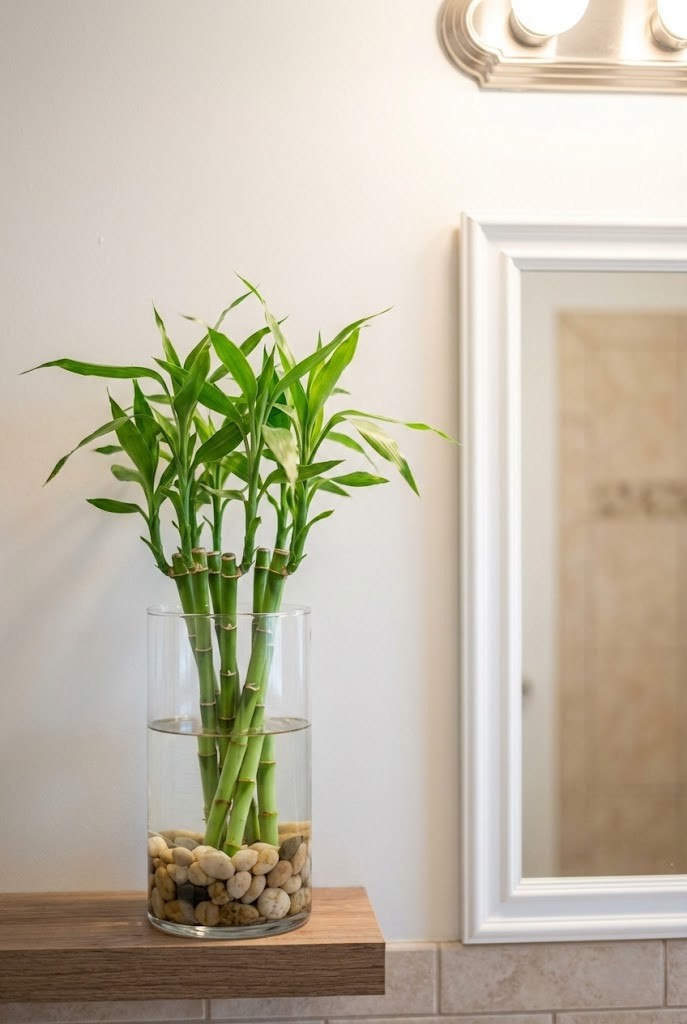 Lucky bamboo is a small-space win: upright, tidy, and easy to place where other plants feel bulky. In a glass container with pebbles, it keeps a clean “spa” look that fits bathrooms, laundry rooms, and tight shelves.