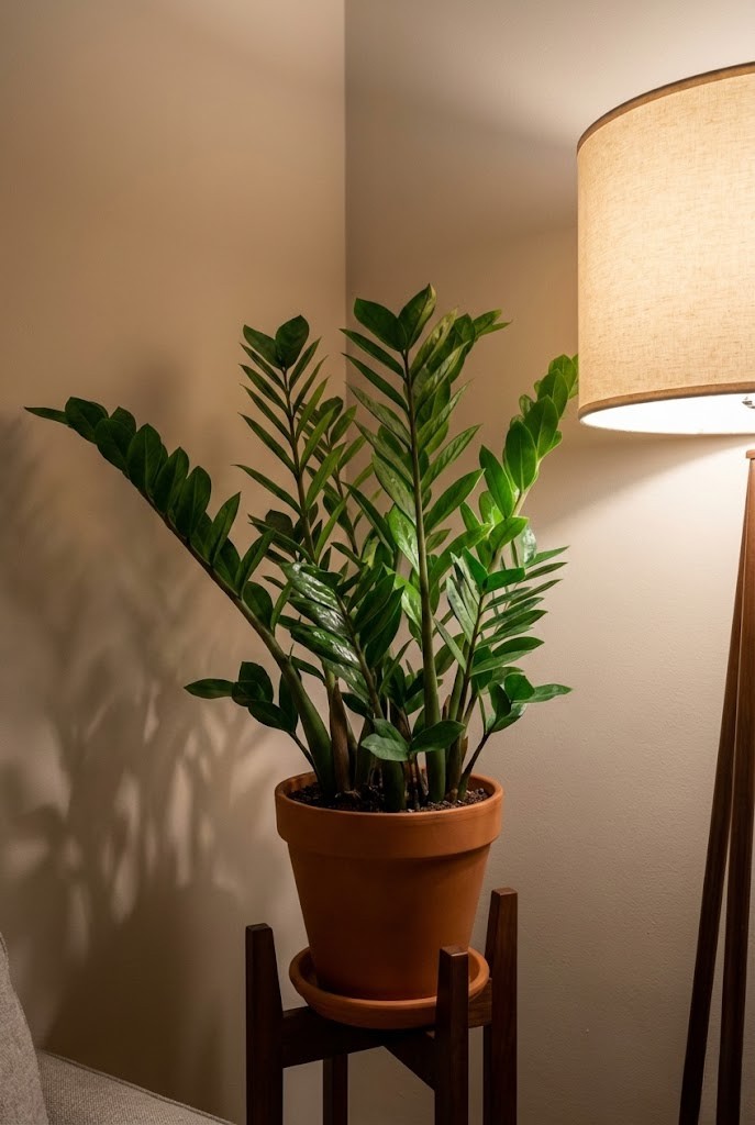 ZZ plants are among the best indoor survivors for artificial light. The stems grow upright, the leaves stay glossy, and the whole plant looks “finished” even when the only light is a floor lamp.