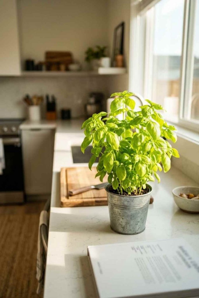 The secret to a long-lived basil plant is constant harvesting; you must pinch off the top leaves to prevent it from flowering. If it flowers, the stems turn woody and the leaves lose their flavor. Keep the soil moist and the drainage clear, and you’ll have fresh pesto ingredients all summer.