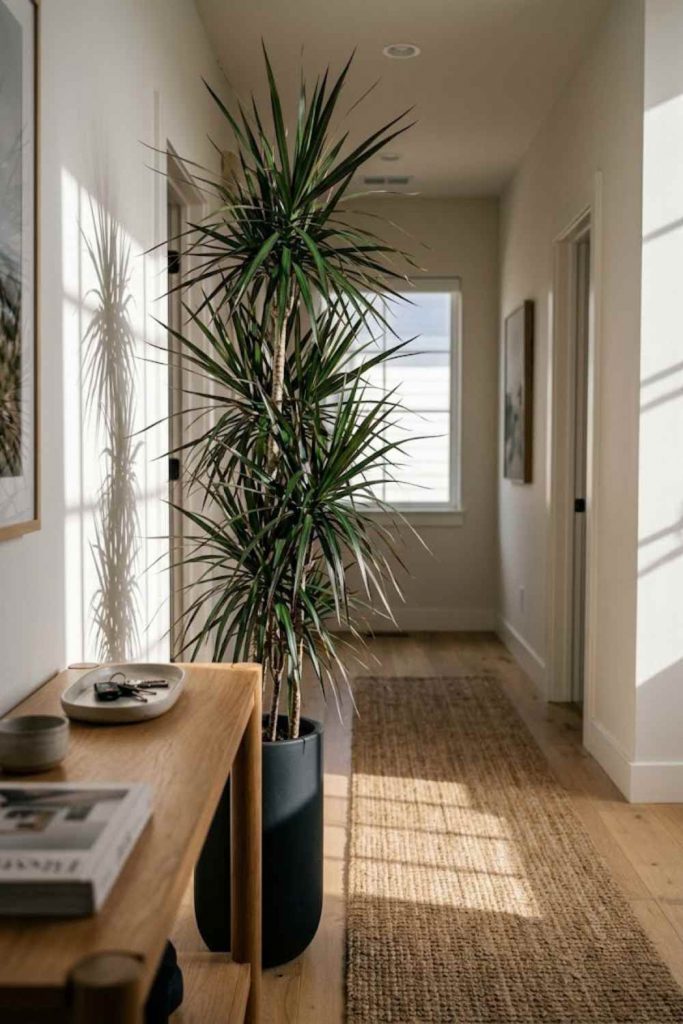 The Dragon Tree is the solution for narrow gaps that need vertical interest. It grows on a slim, upright trunk, reaching for the ceiling without sprawling into your walking path.