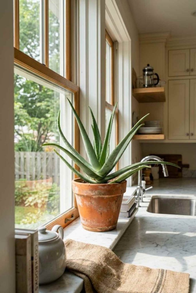 The kitchen windowsill is the natural home for an Aloe. Its thick, serrated leaves give it a desert character, but the true value is functional. The gel inside acts as a localized first-aid kit for the minor nicks and heat-splashes that happen during meal prep.