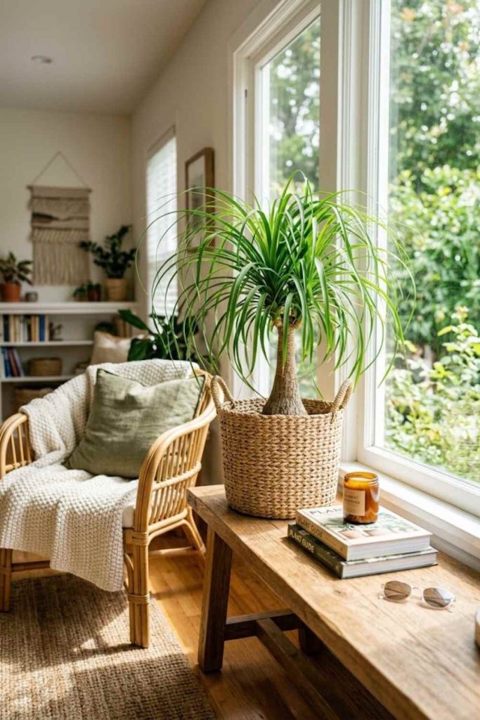 If you share your home with a curious cat and have a habit of forgetting where you put the watering can, the Ponytail Palm is your safest bet. It’s non-toxic and features wispy, curly foliage that can take a bit of batting. The bulbous “elephant’s foot” at the base is a built-in water tank, giving you a massive margin for error if you forget to water.