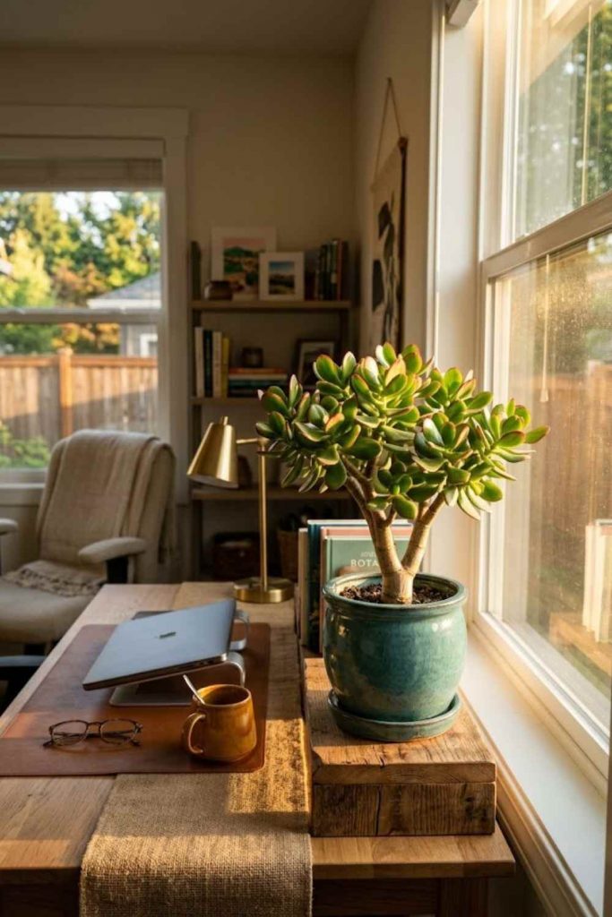 A Jade Plant is essentially a slow-motion bonsai for your desk or sill. With enough direct sun—ideally four hours or more—the edges of the glossy leaves develop a deep reddish tint. This “suntan” is a sign the plant is thriving.