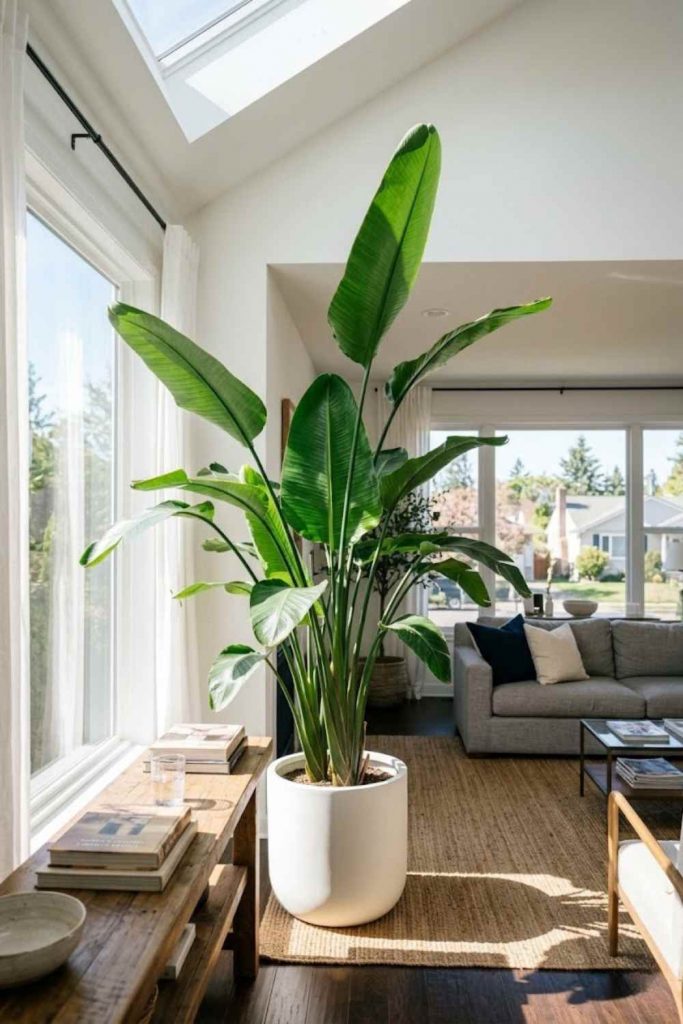 When a room has vaulted ceilings and an awkward, empty corner, the Bird of Paradise fills the void. It’s a high-impact choice with paddle-shaped leaves that can easily hit six feet or more.