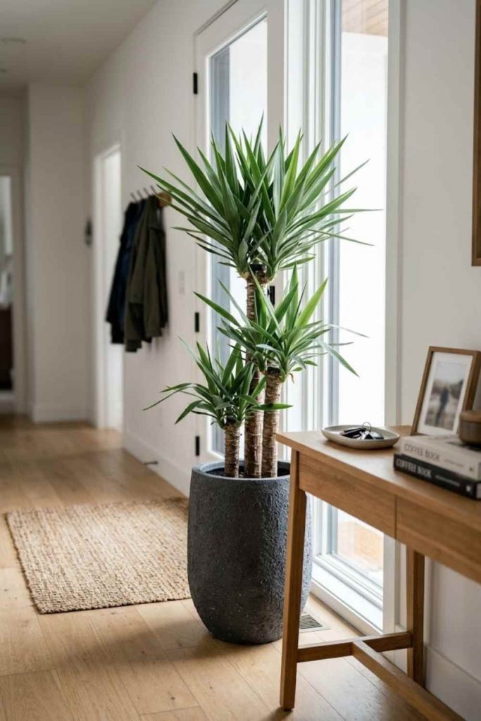 Yucca is a “warrior” plant for entryways or spots near large windows where temperatures swing wildly between the heat of the day and a nighttime chill. It handles drafts and temperature spikes without dropping leaves.