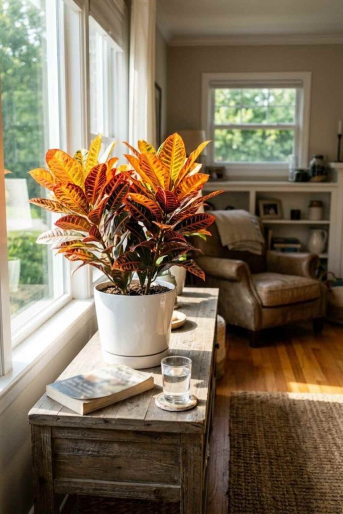 If a room feels sterile or overly “beige,” a Croton provides a necessary jolt of color. Its leaves are a chaotic mix of red, orange, yellow, and black. Light is the literal fuel for these colors; in a dim corner, it will revert to plain green and eventually drop its leaves in protest.