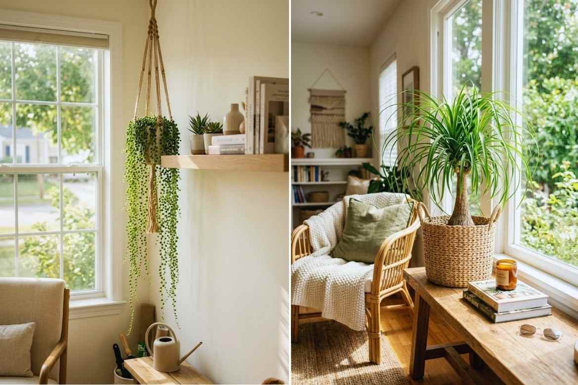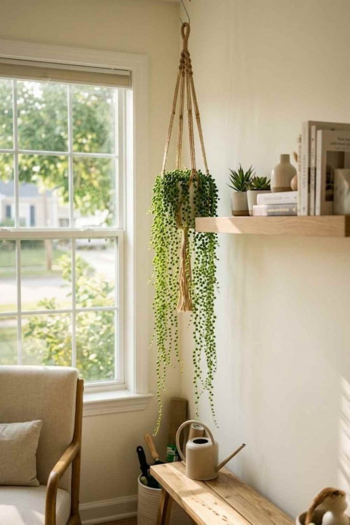 For high shelves or hanging baskets where you want a “waterfall” effect, String of Pearls is the standard. The bead-like leaves are built to store water, making it very forgiving of a missed watering.