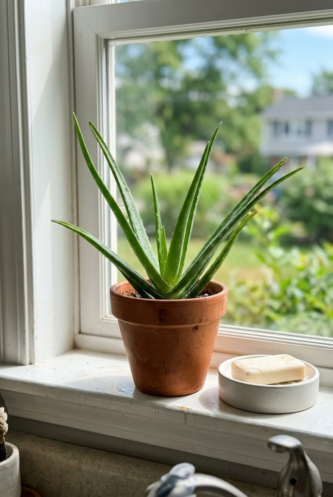 Give it real sun: a bright kitchen window, sunny laundry sill, or near a south- or west-facing window. Aloe prefers a full dry-out between waterings.