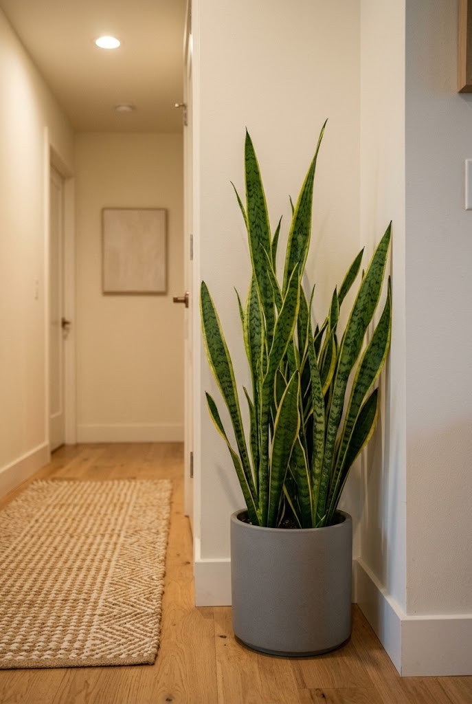 Snake plant is the “clear the corner” option—tall, upright leaves that make a space feel sharper and more contained. Many people use it as a protective plant, especially for areas that feel heavy or stagnant.