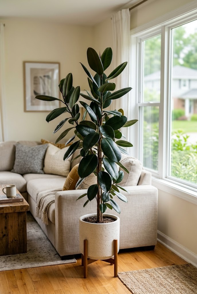 - Living room (vitality + connection): Areca Palm or Rubber Plant